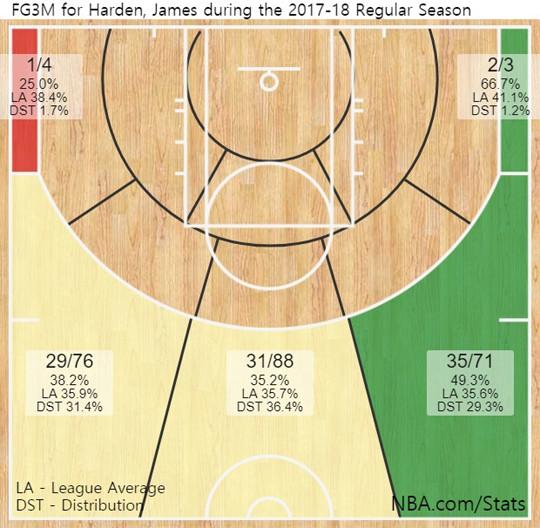 #제임스 하든 정규리그 3점슛 성공률 분포도(*7일 기준)
