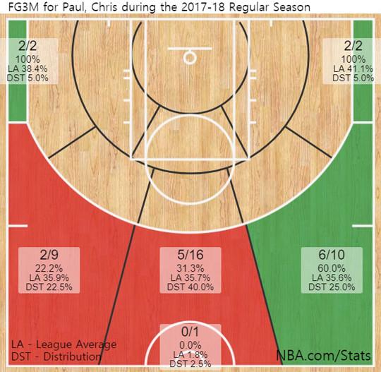 #2017-2018시즌 크리스 폴 정규리그 3점슛 성공률 분포도(*7일 기준)
