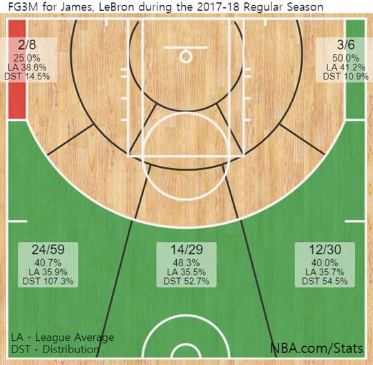 #2017-2018시즌 르브론 제임스 3점슛 성공률 분포도(*10일 기준)