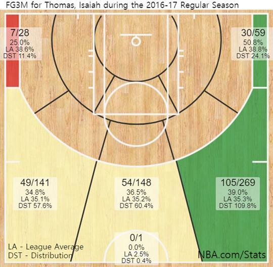 #2016-2017시즌 아이제아 토마스 정규리그 3점슛 성공률 분포도
