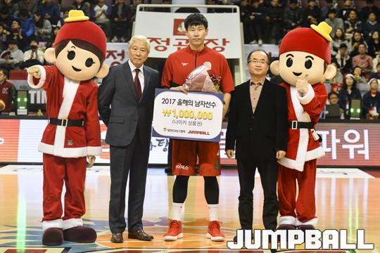 [점프볼=안양/홍기웅 기자] 19일 안양실내체육관에서 열린 '2017-2018 정관장 프로농구' 안양 KGC와 서울 SK의 경기. 점프볼과 함께하는 올해의 농구인 남자 선수 부문에 허훈과 이현중을 제치고 오세근이 수상했다.