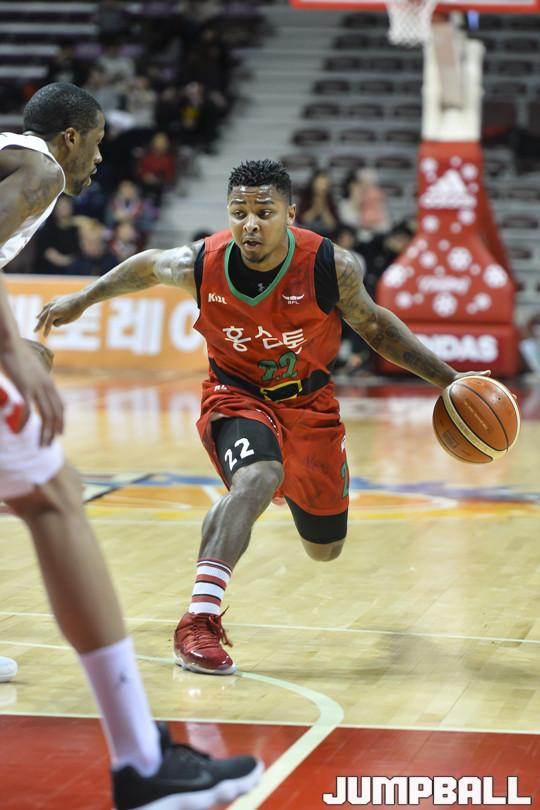 [점프볼=안양/홍기웅 기자] 19일 안양실내체육관에서 열린 '2017-2018 정관장 프로농구' 안양 KGC와 서울 SK의 경기. KGC 큐제이 피터슨이 SK 애런 헤인즈 앞에서 드리블을 하고 있다.