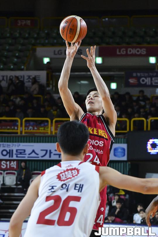 [점프볼=창원/홍기웅 기자] 20일 창원실내체육관에서 열린 '2017-2018 정관장 프로농구' 창원 LG와 고양 오리온의 경기. LG 조성민이 외곽 슛을 던지고 있다.