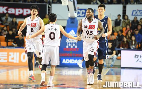 [점프볼=전주/문복주 기자] 20일 전주실내체육관에서 열린 '2017-2018 정관장 프로농구' 전주 KCC와 부산 KT의 경기. KT 맥키네스와 김기윤이 멋진 콤비로 득점하고 하이파이브를 하고 있다.