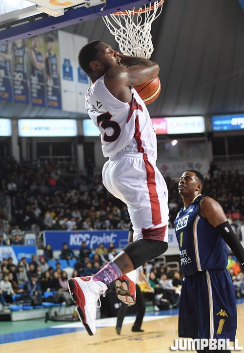 [점프볼=전주/문복주 기자] 20일 전주실내체육관에서 열린 '2017-2018 정관장 프로농구' 전주 KCC와 부산 KT의 경기. KT 맥키네스가 파워 덩크를 작렬하고 있다.