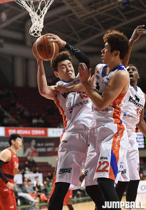 [점프볼=원주/홍기웅 기자] 23일 원주종합체육관에서 열린 '2017-2018 정관장 프로농구' 원주 DB와 고양 오리온의 경기. DB 서민수와 오리온 허일영이 골밑에서 자리 싸움을 하고 있다.