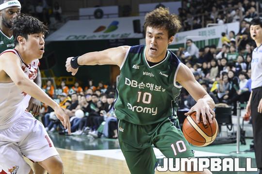 [점프볼=원주/홍기웅 기자] 23일 원주종합체육관에서 열린 '2017-2018 정관장 프로농구' 원주 DB와 고양 오리온의 경기. DB 김태홍이 드리블로 수비를 제치고 있다.