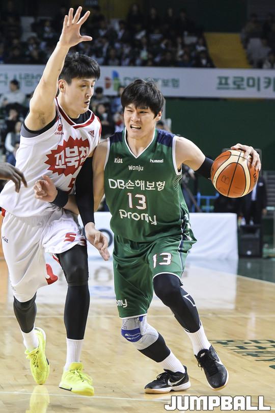 [점프볼=원주/홍기웅 기자] 23일 원주종합체육관에서 열린 '2017-2018 정관장 프로농구' 원주 DB와 고양 오리온의 경기. DB 윤호영이 오리온 최진수의 수비에 힘겨워하고 있다.