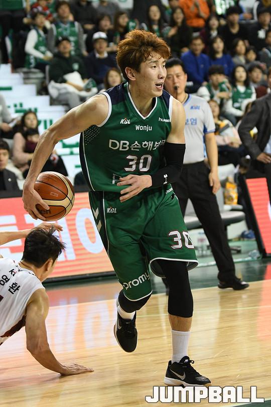 24일 원주종합체육관에서 열린 '17-18 정관장 프로농구 원주 DB 와 부산 KT 의 경기에서 두경민이 돌파 중 비하인드 백 패스를 시도하고 있다.