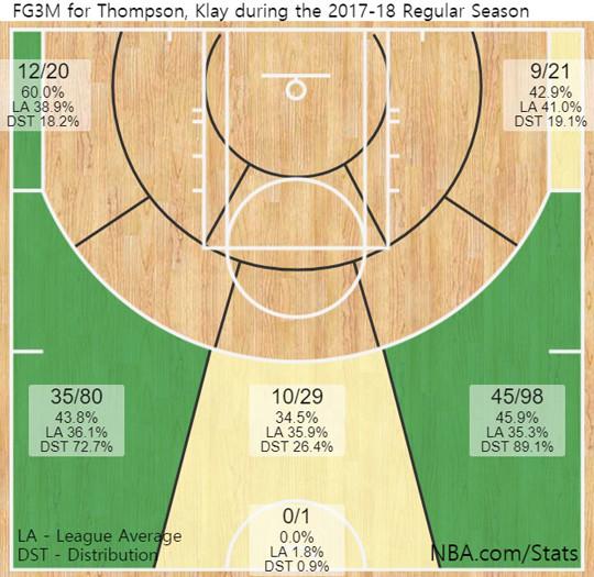 #클레이 탐슨 2017-2018시즌 정규리그 3점슛 성공률 분포도(*24일 기준)