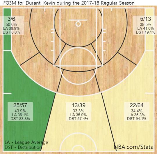 #케빈 듀란트 2017-2018시즌 정규리그 3점슛 성공률 분포도(*24일 기준)