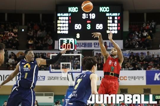 [점프볼=군산/김병문 기자] 25일 군산월명체육관에서 열린 정관장프로농구 KBL2017-2018 시즌 전주 KCC와 안양 KGC의 경기, KGC 큐제이 피터슨이 슛을 쏘고 있다.