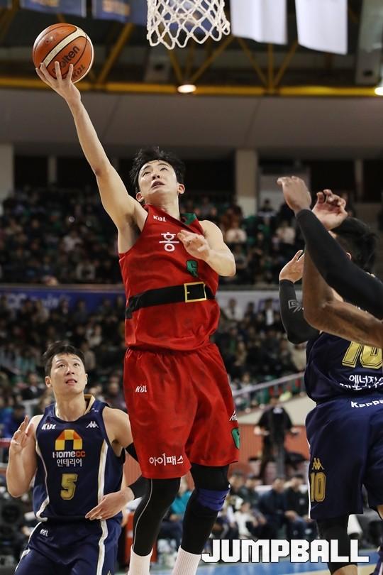 [점프볼=군산/김병문 기자] 25일 군산월명체육관에서 열린 정관장프로농구 KBL2017-2018 시즌 전주 KCC와 안양 KGC의 경기, KGC 강병현이 레이업 슛을 올리고 있다.