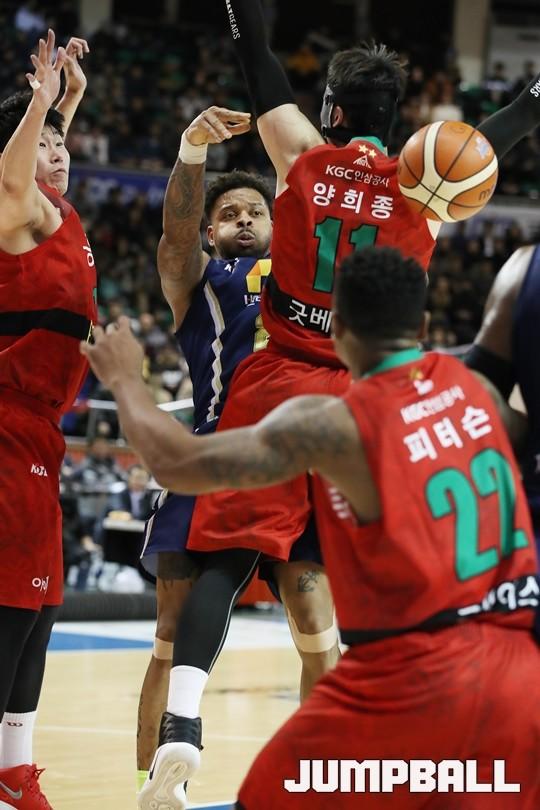 [점프볼=군산/김병문 기자] 25일 군산월명체육관에서 열린 정관장프로농구 KBL2017-2018 시즌 전주 KCC와 안양 KGC의 경기, KCC 안드레 에밋이 패스를 하고 있다.