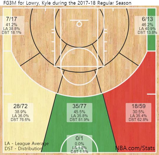#2017-2018시즌 카일 라우리, 정규리그 3점슛 성공률(*28일 기준)