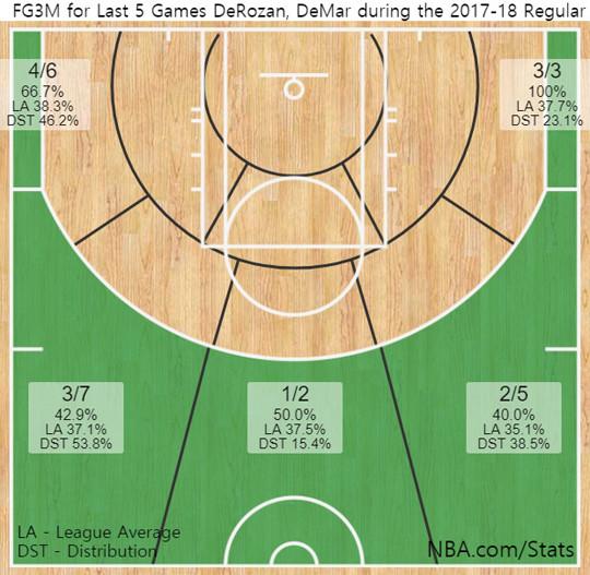 #2017-2018시즌 더마 드로잔, 최근 5경기 3점슛 성공률 분포도(*28일 기준)
