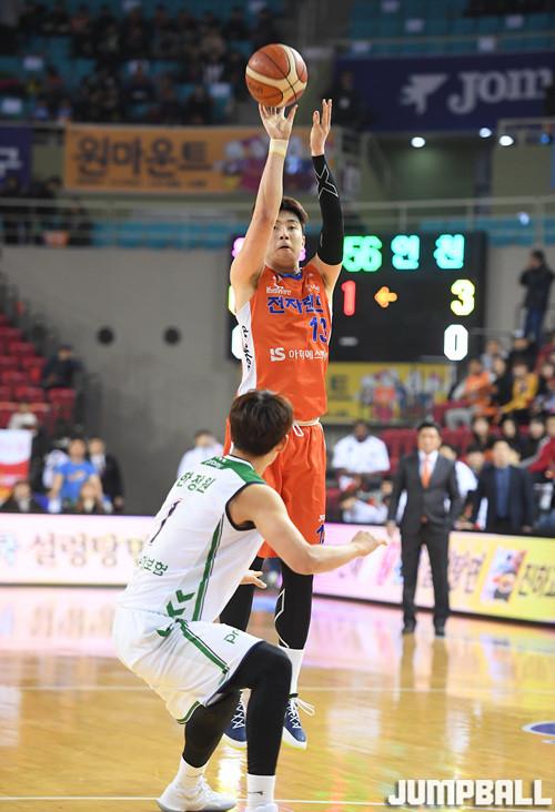 [점프볼=인천 문복주/기자] 30일 인천 삼산월드체육관에서 열린 '2017-2018 정관장 프로농구' 인천 전자랜드와 원주 DB의 경기, 전자랜드 강상재가 3점슛을 거침없이 던지고 있다.