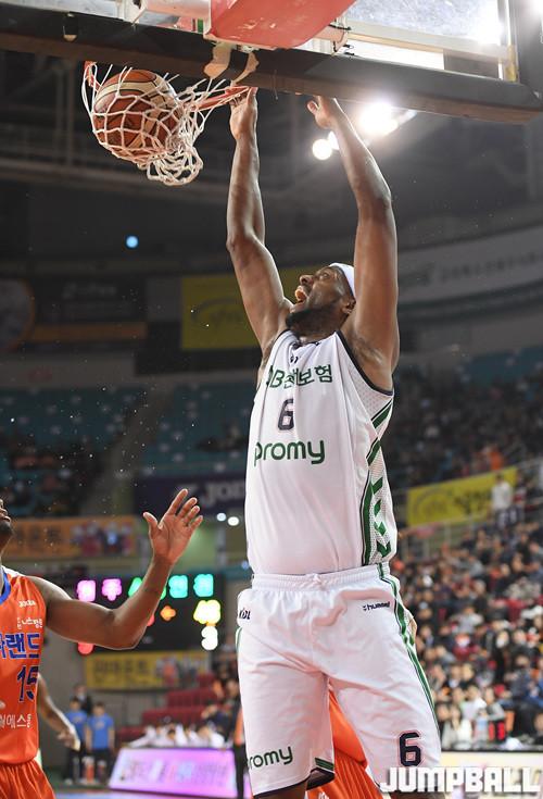 [점프볼=인천 문복주/기자] 30일 인천 삼산월드체육관에서 열린 '2017-2018 정관장 프로농구' 인천 전자랜드와 원주 DB의 경기, DB 벤슨이 골밑을 장악하고 투핸드 덩크를 작렬하고 있다.