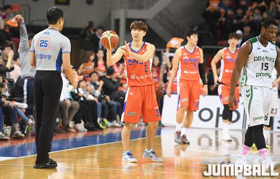 [점프볼=인천 문복주/기자] 30일 인천 삼산월드체육관에서 열린 '2017-2018 정관장 프로농구' 인천 전자랜드와 원주 DB의 경기, 전자랜드의 홈 승리를 앞두고 김낙현이 심판에 볼을 건내고 있다.