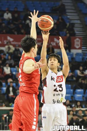 [점프볼=잠실/홍기웅 기자] 30일 잠실학생체육관에서 열린 '2017-2018 정관장 프로농구' 서울 SK와 부산 KT의 경기. KT 박철호가 외곽 슛을 던지고 있다.