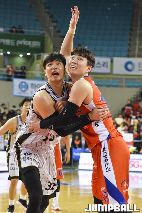 [점프볼=삼산/홍기웅 기자] 31일 인천삼산체육관에서 열린 '2017-2018 정관장 프로농구' 인천 전자랜드와 창원 LG의 경기. LG 김종규와 전자랜드 강상재가 리바운드를 하기 위해 자리싸움을 하고 있다.