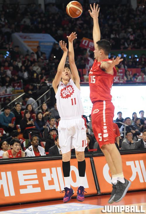 [점프볼=잠실학생 문복주/기자] 31일 잠실학생체육관에서 열린 '2017-2018 정관장 프로농구' 서울 SK와 고양 오리온의 경기. 오리온 허일영이 고감도 3점슛을 던지고 있다.