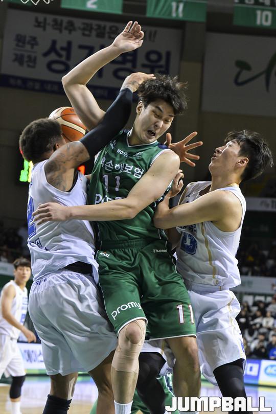 [점프볼=원주/홍기웅 기자] 1일 원주종합체육관에서 열린 '2017-2018 정관장 프로농구' 원주 DB와 전주 KCC의 경기. DB 유성호와 KCC 선수들이 골밑에서 리바운드 경합을 하고 있다.