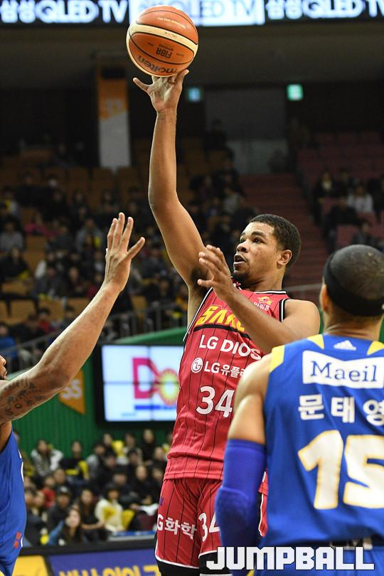 1일 잠실실내체육관에서 열린 '17-18 정관장 프로농구 서울 삼성 과 창원 LG 의 경기에서 에릭 와이즈가 골밑슛을 시도하고 있다.