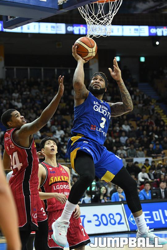 1일 잠실실내체육관에서 열린 '17-18 정관장 프로농구 서울 삼성 과 창원 LG 의 경기에서 마키스 커밍스가 공중에서 수비를 따돌리고 골밑슛을 시도하고 있다.