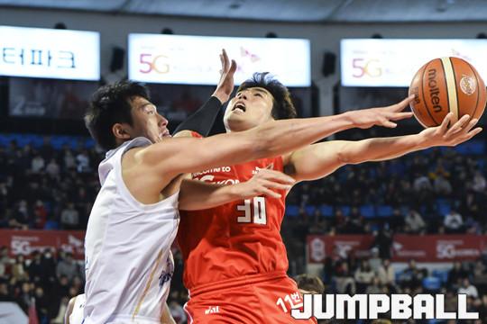 [점프볼=잠실/홍기웅 기자] 7일 잠실학생체육관에서 열린 '2017-2018 정관장 프로농구' 서울 SK와 전주 KCC의 경기. SK 정재홍이 골 밑에서 KCC 이정현의 수비에도 불구하고 슛을 시도하고 있다.