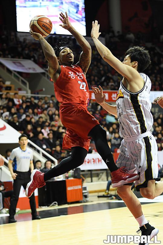 [점프볼=안양/유용우 기자] 07일 안양 실내체육관에서 열린 '2017-2018 정관장 프로농구' 안양 KGC 인삼공사와 창원 LG의 경기, KGC 피터슨이 LG 진영으로 파고 들며 공격을 시도하고 있다.