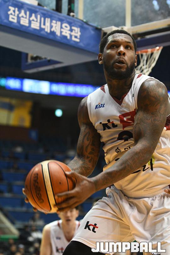 10일 잠실실내체육관에서 열린 '17-18 정관장 프로농구 서울 삼성 과 부산 KT 의 경기에서 웬델 맥키네스가 나가는 공을 살려 공중에서 던지려 하고 있다.