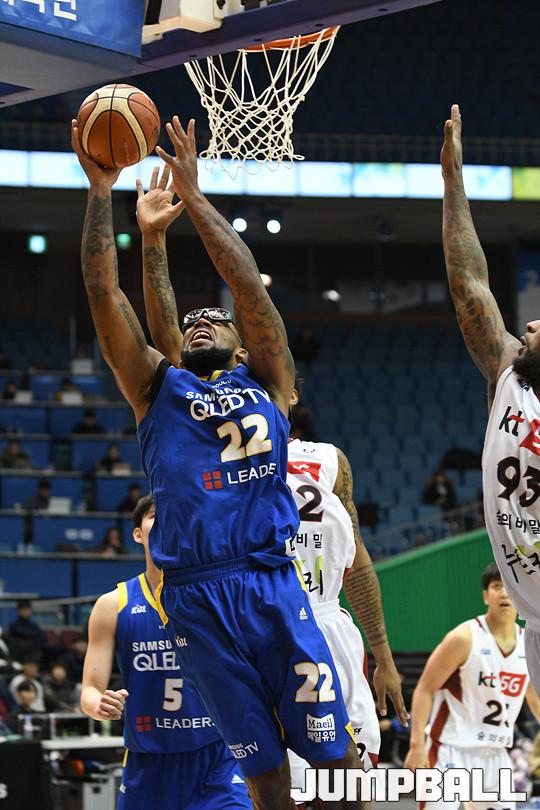 10일 잠실실내체육관에서 열린 '17-18 정관장 프로농구 서울 삼성 과 부산 KT 의 경기에서 칼 홀 이 골밑슛을 시도하고 있다.