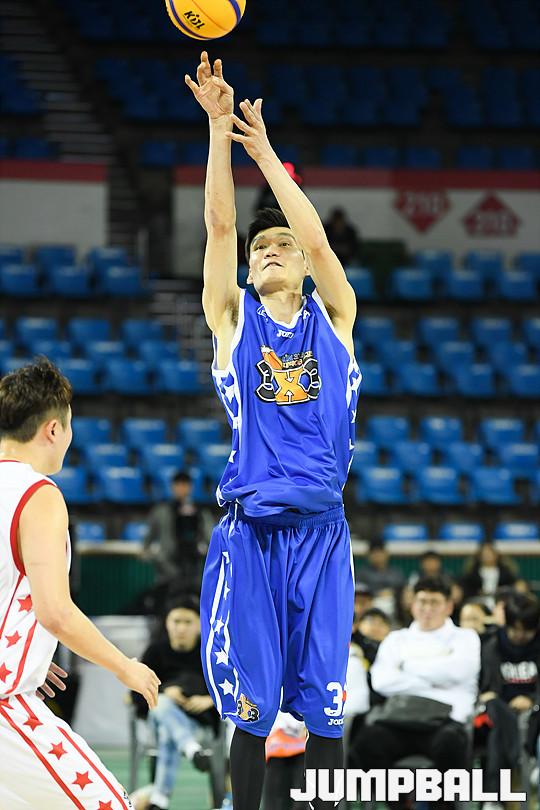 [점프볼=잠실학생체/유용우 기자] 13일 잠실 학생체육관에서 '2017-2018 정관장 프로농구 올스타전' 1일차 이벤트로 KBL 3X3 대학 OB 최강전이 펼쳐졌다. 대학농구연맹 1부 12개 대학을 대표하는 출신 대학 프로선수들이 올스타 팀을 이뤄 우승을 가리는 3X3 농구 토너먼트 대회이다. 중앙대와 단국대의 4강 경기, 중앙대 OB 김주성이 슛을 시도하고 있다.