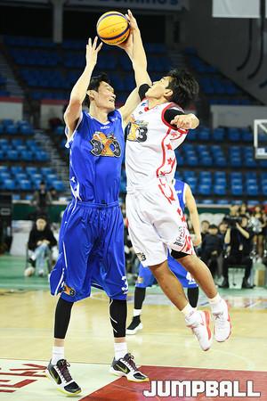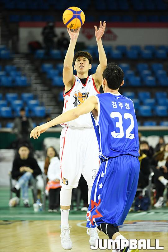 [점프볼=잠실학생체/유용우 기자] 13일 잠실 학생체육관에서 '2017-2018 정관장 프로농구 올스타전' 1일차 이벤트로 KBL 3X3 대학 OB 최강전이 펼쳐졌다. 대학농구연맹 1부 12개 대학을 대표하는 출신 대학 프로선수들이 올스타 팀을 이뤄 우승을 가리는 3X3 농구 토너먼트 대회이다. 중앙대와 단국대의 4강 경기, 단국대 OB 김상규가 슛을 시도하고 있다.