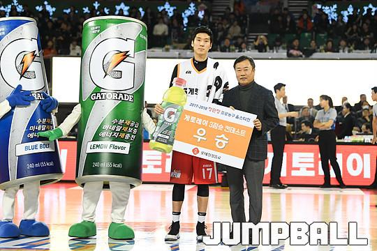[점프볼=잠실학생체/유용우 기자] 14일 잠실 학생체육관에서 '2017-2018 정관장 프로농구 올스타전' 2일차, 3점슛 콘테스트에서 화이트와 맞붙은 전준범이 우승을 차지하였다.