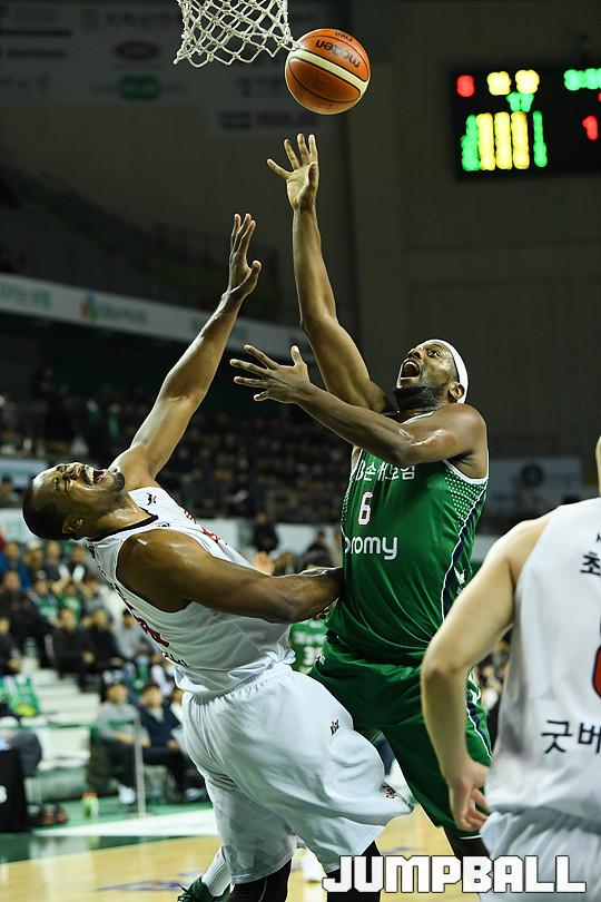 [점프볼=원주/유용우 기자] 16일 원주 종합체육관에서 열린 '2017-2018 정관장 프로농구' 원주 DB와 안양 KGC 인삼공사의 경기, DB 벤슨의 공격을 수비하다 KGC 사이먼이 넘어지고 있다.