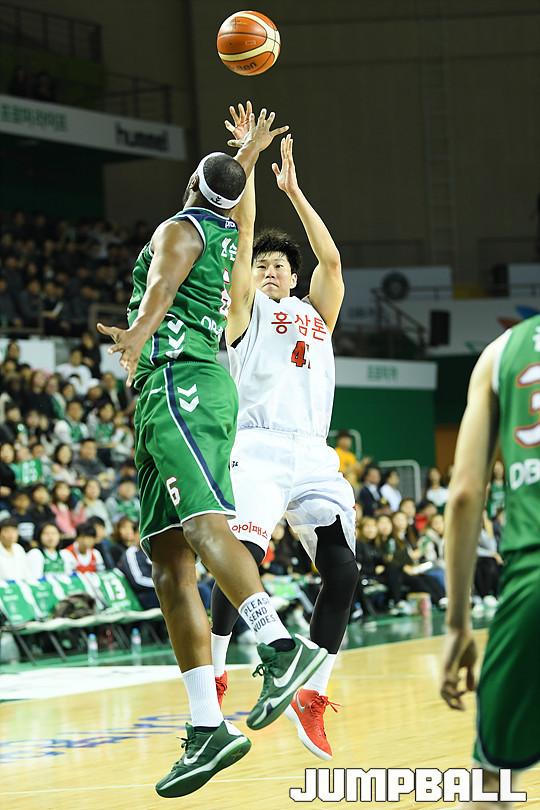 [점프볼=원주/유용우 기자] 16일 원주 종합체육관에서 열린 '2017-2018 정관장 프로농구' 원주 DB와 안양 KGC 인삼공사의 경기, KGC 오세근이 페이더웨이 슛을 쏘고 있다.