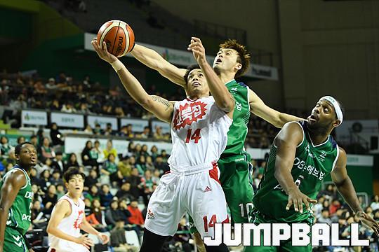 [점프볼=원주/유용우 기자] 18일 원주 종합체육관에서 열린 '2017-2018 정관장 프로농구' 원주 DB와 고양 오리온의 경기, DB 김태홍이 오리온 에드워즈의 공격을 수비하고 있다.