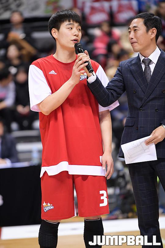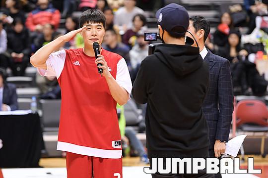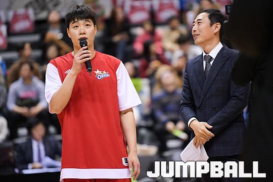 [점프볼=고양/유용우 기자] 20일 고양실내체육관에서 열린 '2017-2018 정관장 프로농구' 고양 오리온과 안양 KGC 인삼공사의 경기, 오리온 한호빈과 박재현이 군복무를 마치고 팬들에게 인사를 하고 있다.