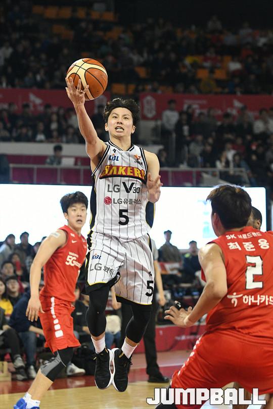 20일 잠실학생체육관에서 열린 '17-18 정관장 프로농구 서울 SK 와 창원 LG 의 경기에서 김시래가 돌파에 이은 레이업슛을 시도하고 있다.