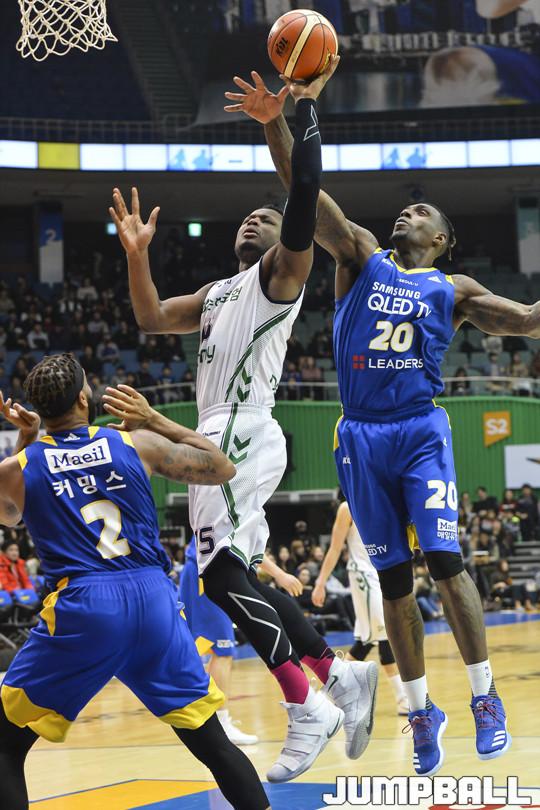 [점프볼=잠실/홍기웅 기자] 20일 잠실실내체육관에서 열린 '2017-2018 정관장 프로농구' 서울 삼성과 원주 DB의 경기. DB 디온테 버튼이 삼성 리카르도 라틀리프의 수비에도 불구하고 레이업을 올리고 있다.