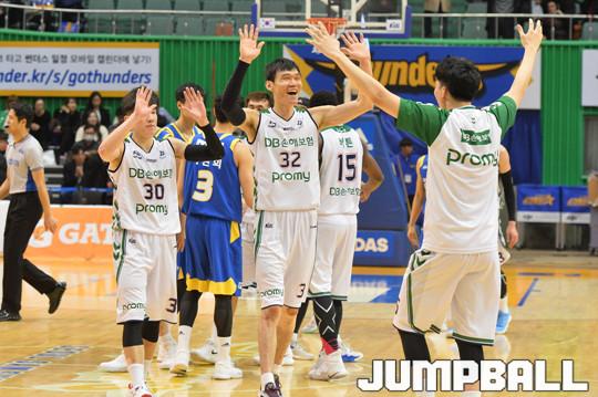 [점프볼=잠실/홍기웅 기자] 20일 잠실실내체육관에서 열린 '2017-2018 정관장 프로농구' 서울 삼성과 원주 DB의 경기. DB 선수들이 승리를 확정짓자 기뻐하고 있다.