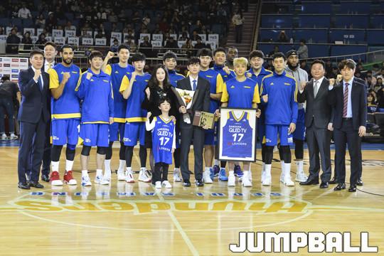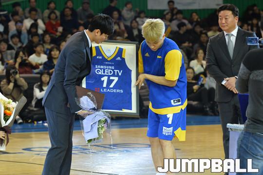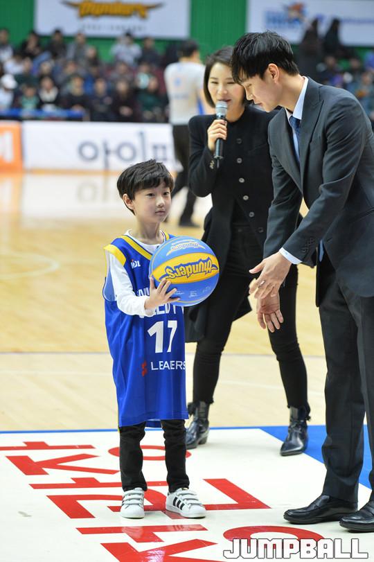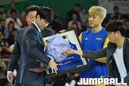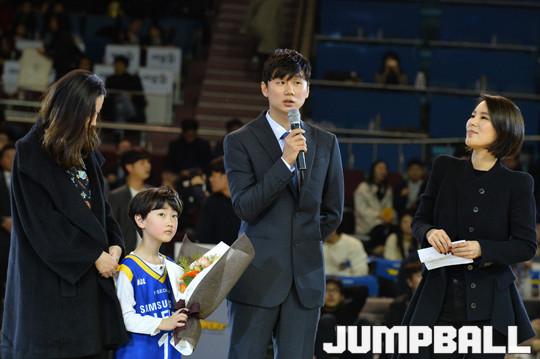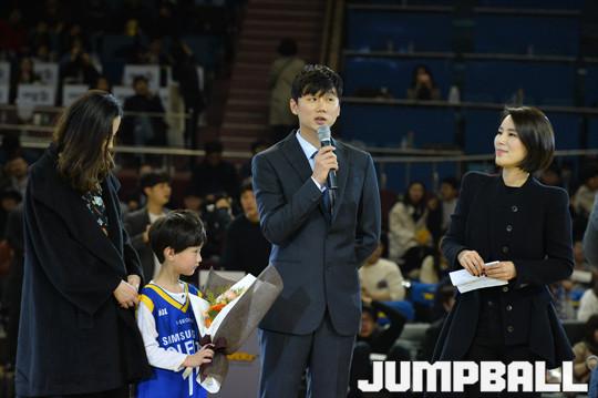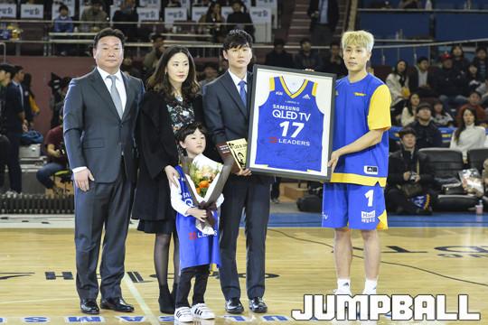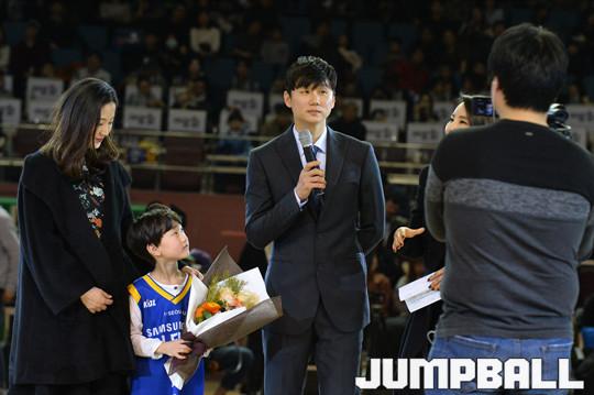[점프볼=잠실/홍기웅 기자] 20일 잠실실내체육관에서 열린 '2017-2018 정관장 프로농구' 서울 삼성과 원주 DB의 경기 하프타임때 서울 삼성 썬더스 이시준의 은퇴식이 진행됐다. 삼성 이시준은 9시즌간 삼성에서만 보내 그 의미가 뜻깊었다. 경기 시작전 이시준과 이시헌 군(아들)의 시투로 시작해 하프타임때 기념 유니폼 액자를 전달하는 것으로 마무리 했다.