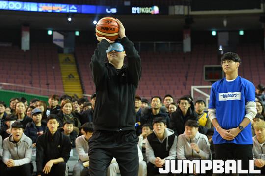 [점프볼=잠실/홍기웅 기자] 20일 잠실실내체육관에서 열린 '2017-2018 정관장 프로농구' 서울 삼성과 원주 DB의 경기가 끝난 후 서울 삼성은 '우리들만의 올스타전' 이벤트를 진행했다. 우리들의 올스타전은 20일에 관람한 팬들을 대상으로 선수모두가 나와 안대쓰고 자유투, 3점슛 컨테스트, QLED 슈팅 챌린지 등을 즐겨 원주 DB와의 패배를 잊고 팬들과 즐기는 시간을 가졌다. 안대쓰고 자유투(Welcome to the Thunders)에 참여한 김동욱이 자유투를 던지고 있다.
