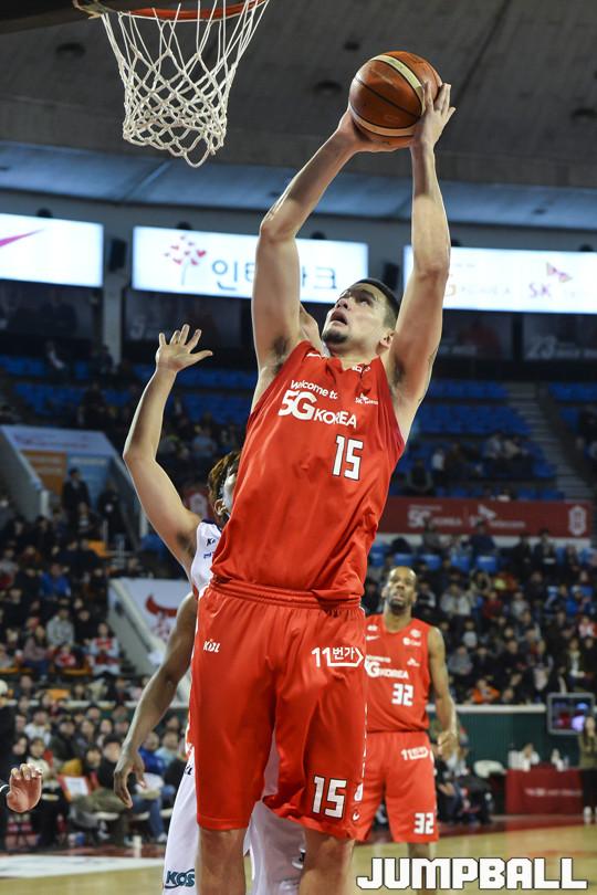 [점프볼=잠실/홍기웅 기자] 21일 잠실학생체육관에서 열린 '2017-2018 정관장 프로농구' 서울 SK와 인천 전자랜드의 경기. SK 김민수가 오픈 찬스에서 골밑 슛을 던지고 있다.