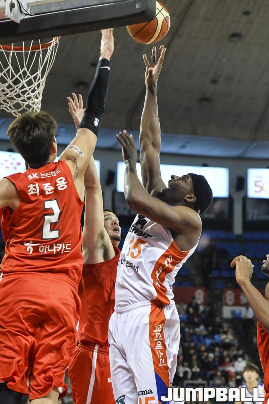 [점프볼=잠실/홍기웅 기자] 21일 잠실학생체육관에서 열린 '2017-2018 정관장 프로농구' 서울 SK와 인천 전자랜드의 경기. 전자랜드 브랜든 브라운이 골밑 슛을 던지고 있다.