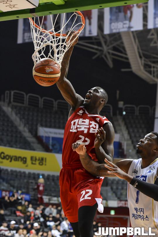 [점프볼=고양/홍기웅 기자] 23일 고양실내체육관에서 열린 '2017-2018 정관장 프로농구' 고양 오리온과 전주 KCC의 경기. 오리온 버논 맥클린이 덩크를 꽂고 있다.