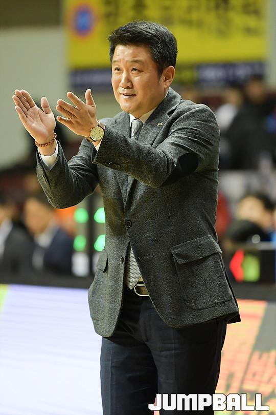 [점프볼=안양/유용우 기자] 23일 안양실내체육관에서 열린 '2017-2018 정관장 프로농구' 안양 KGC 인삼공사와 인천 전자랜드의 경기, 전자랜드 유도훈 감독이 선수들에게 박수를 보내고 있다.