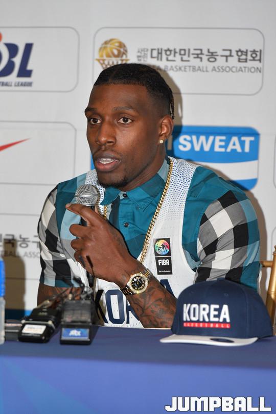[점프볼=서울/홍기웅 기자] 25일 임피리얼 팰리스 서울 6층 MEgrez홀에서 열린 '리카르도 라틀리프 특별 귀화 기자회견'. 리카르도 라틀리프가 인터뷰를 하고 있다.